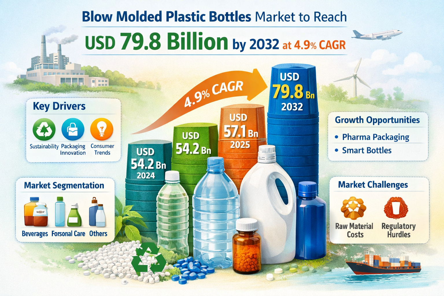 Blow Molded Plastic Bottles Market to Reach USD 79.8 Billion by 2032 at 4.9% CAGR