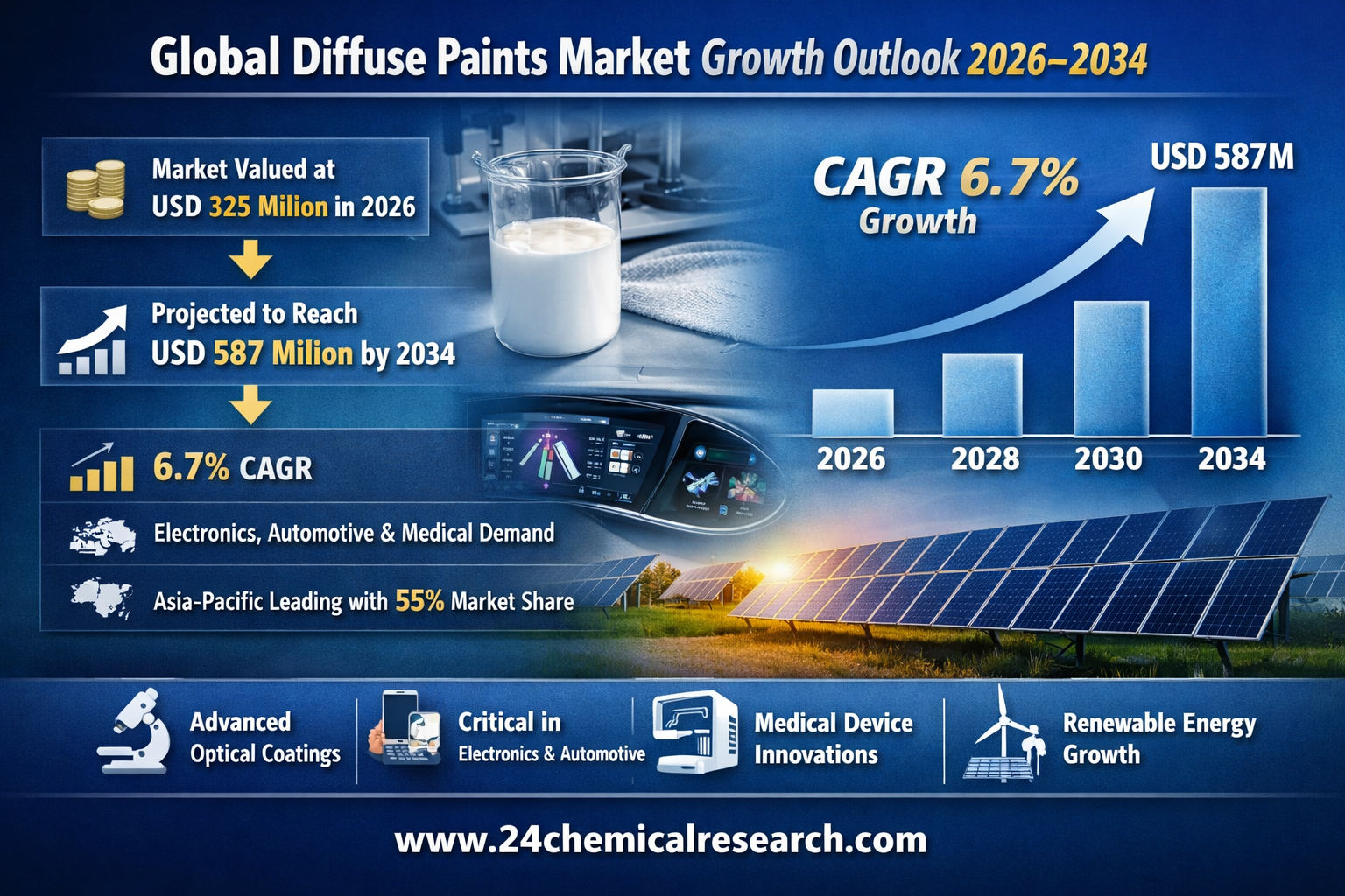 Renewable Energy Integration: The solar energy sector presents substantial growth potential, with diffuse paints enhancing light capture in photovoltaic systems. These coatings improve efficiency by 3-5% in certain panel configurations by reducing reflection losses and managing light distribution. With global solar installations projected to exceed 350 GW annually by 2034, this application could represent a USD 200-300 million opportunity for advanced optical coatings.